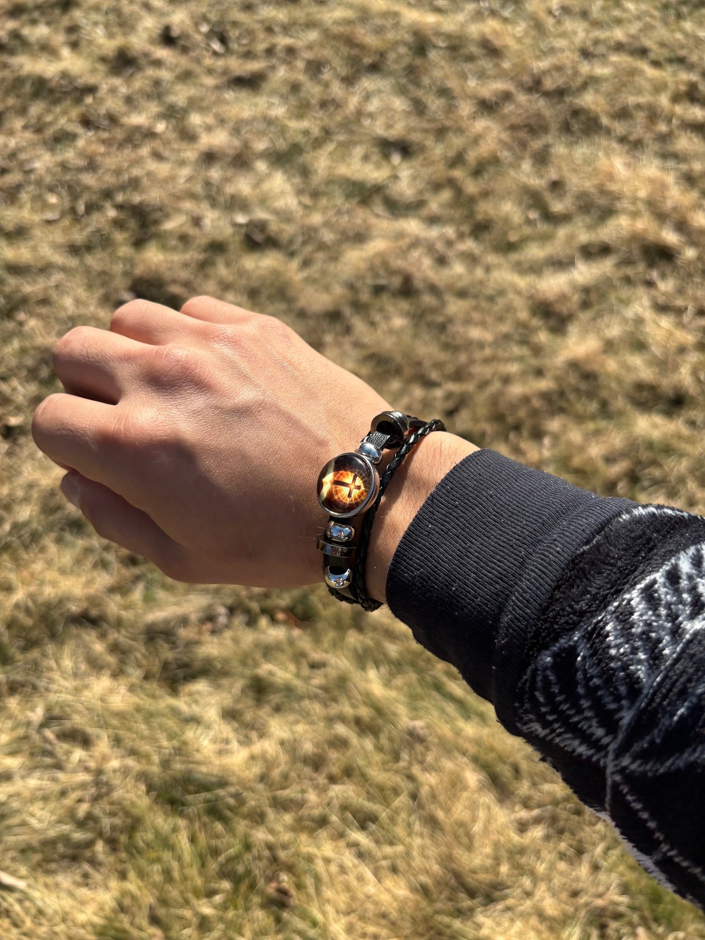 The bracelet is crafted from braided leather and stainless steel accents , designed for durability, comfort, and everyday wear.